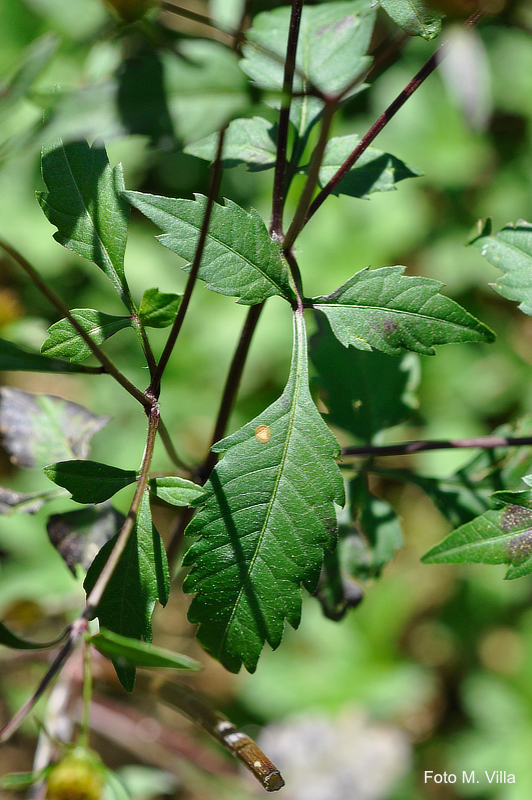 Le foglie sono picciolate ed opposte, profondamente divise in 3 segmenti (raramente 5) lanceolati dei quali il centrale più grande. Il margine è seghettato con dentelli acuti e distanziati, l'apice è acuto.