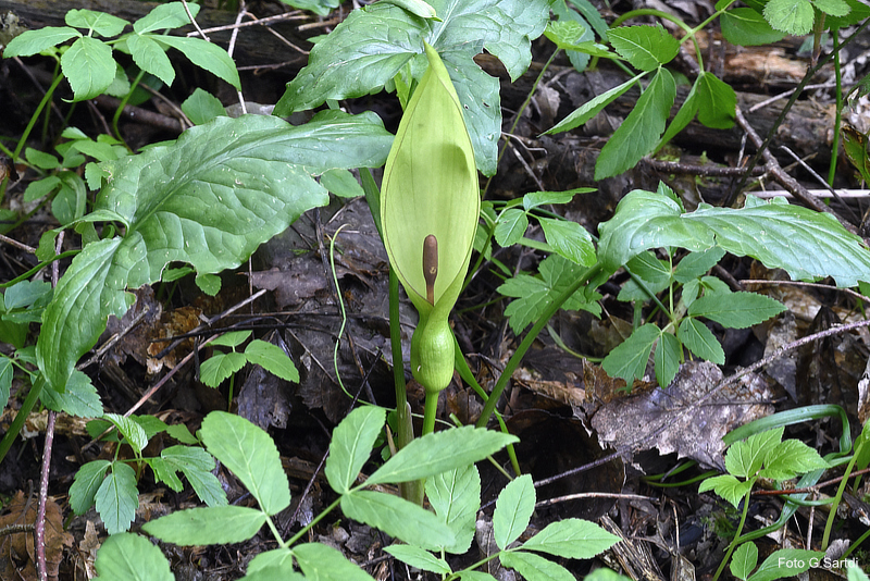 Il Gigaro scuro è una pianta erbacea alta 20-40 cm dall'aspetto inconfondibile. E' simile all'Arum italicum ma è più diffuso nel Parco e cresce nei boschi umidi e lungo le sponde dei corsi d'acqua.