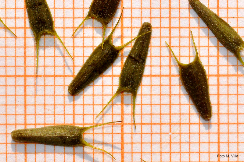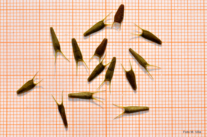 I frutti sono acheni nerastri più o meno appiattiti con brevi peli sparsi, piuttosto lisci, non tubercolati. All'apice presentano due protuberanze appuntite che si attaccano facilmente ai vestiti e al vello degli animali, favorendone la disseminazione (zoocora).