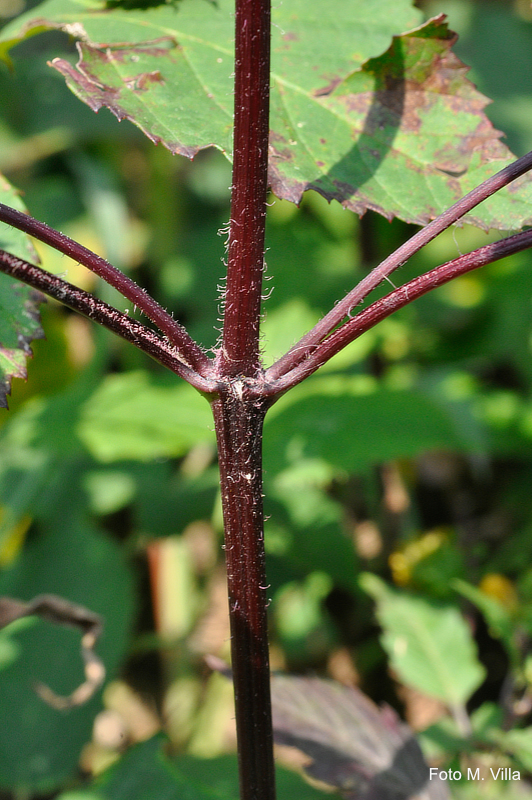 Il fusto è eretto e ramificato, quadrangolare con angoli arrotondati, spesso arrossato.